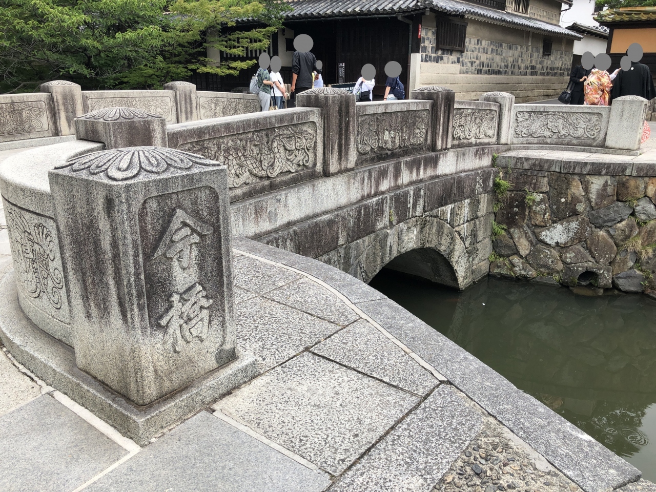 美観地区の倉敷川に架かる橋の中では最も北側にある橋です。この近くには白鳥と白鳥の子どももいて、観光客の目を楽しませていましたが、えさを与えないようにという看板がありました。倉敷川を白鳥が優雅に泳ぐ様子を見るだけで和みました。