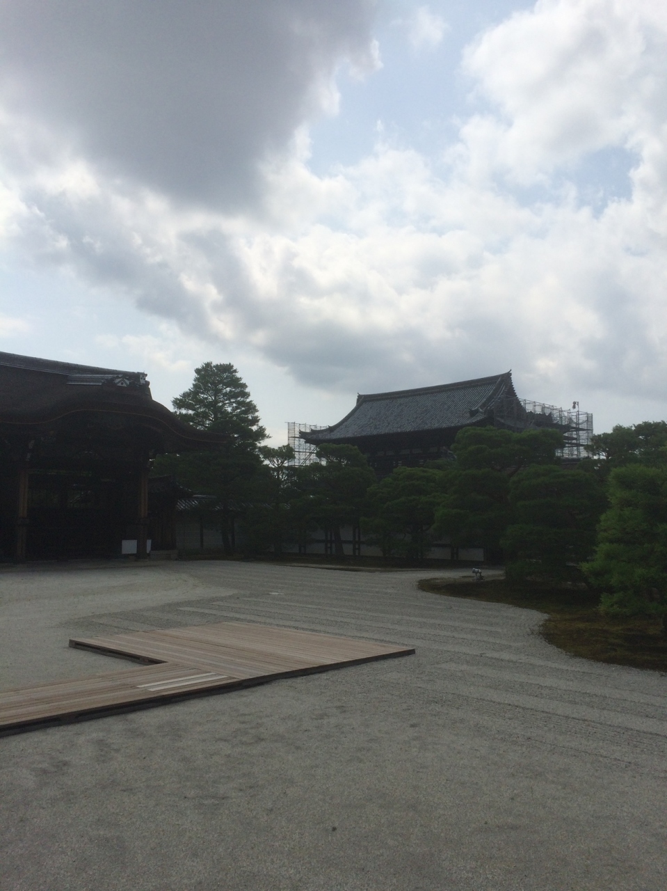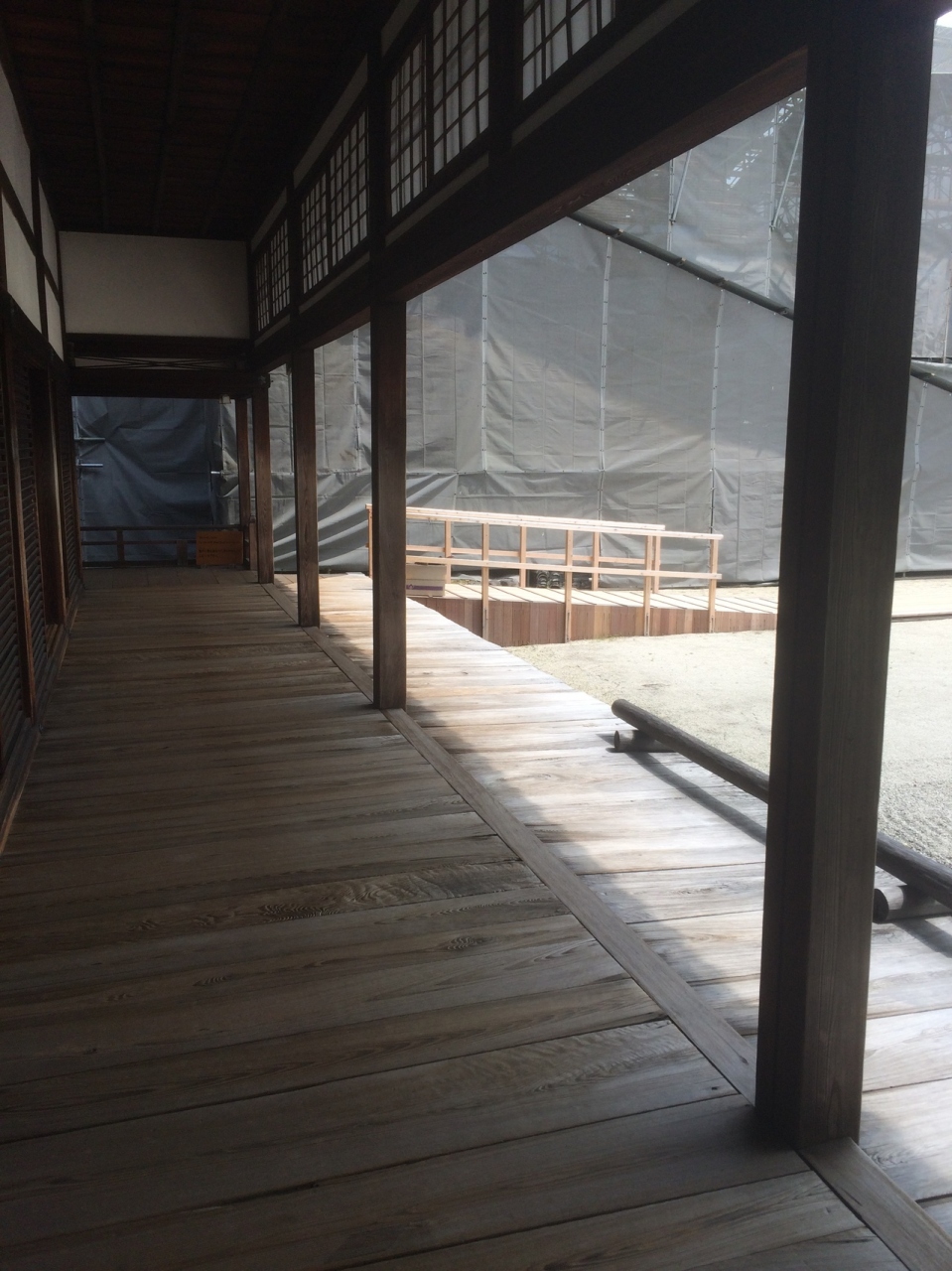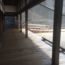 御殿入口から靴を脱いで上がると古い渡り廊下です。廊下の前に、砂を模した庭園があり、外に行くことが出来、外から白書院の建物全体を見ることが出来るのが良いです。横長の建物で、屋根が建物の半分近くを占めていました。下部は木造で歴史ある建物でした。