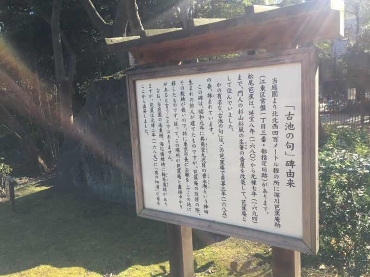 こちらは清澄白河に馴染み深い松尾芭蕉の有名な句碑で、古池や かはづ飛び込む 水の音、という句になります。