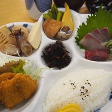 メインの皿に、刺身、白身魚フライ、煮物、おつまみ、白飯等、様々な料理が盛られている。