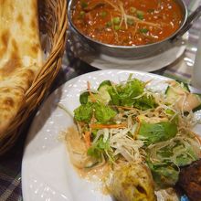 サラダ、タンドリーチキン、マライティッカ、シークカハブは、ワンプレートに、彩りよく盛られている。インドの様々な肉料理がいただけるのは有り難い。