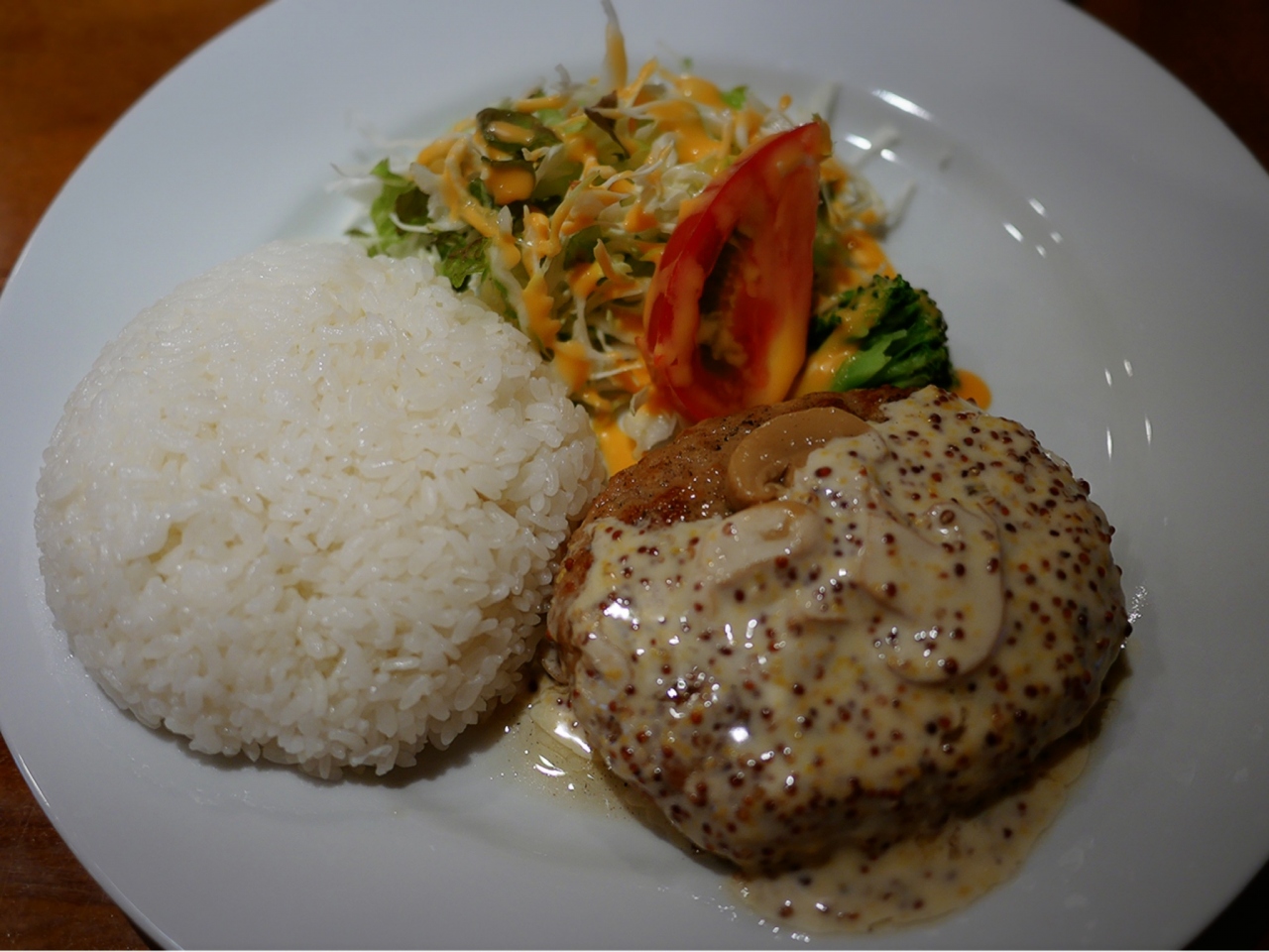 ハンバーグは、ふんわりとゴツゴツの中間的な柔らかさ。ミンチ肉がきめ細かく、噛みしめると練りこまれたスパイスの風味を感じます。マスタードソースは、優しい味わいで、ほんのり酸味を感じるので、ハンバーグ自体が少し甘く感じます。