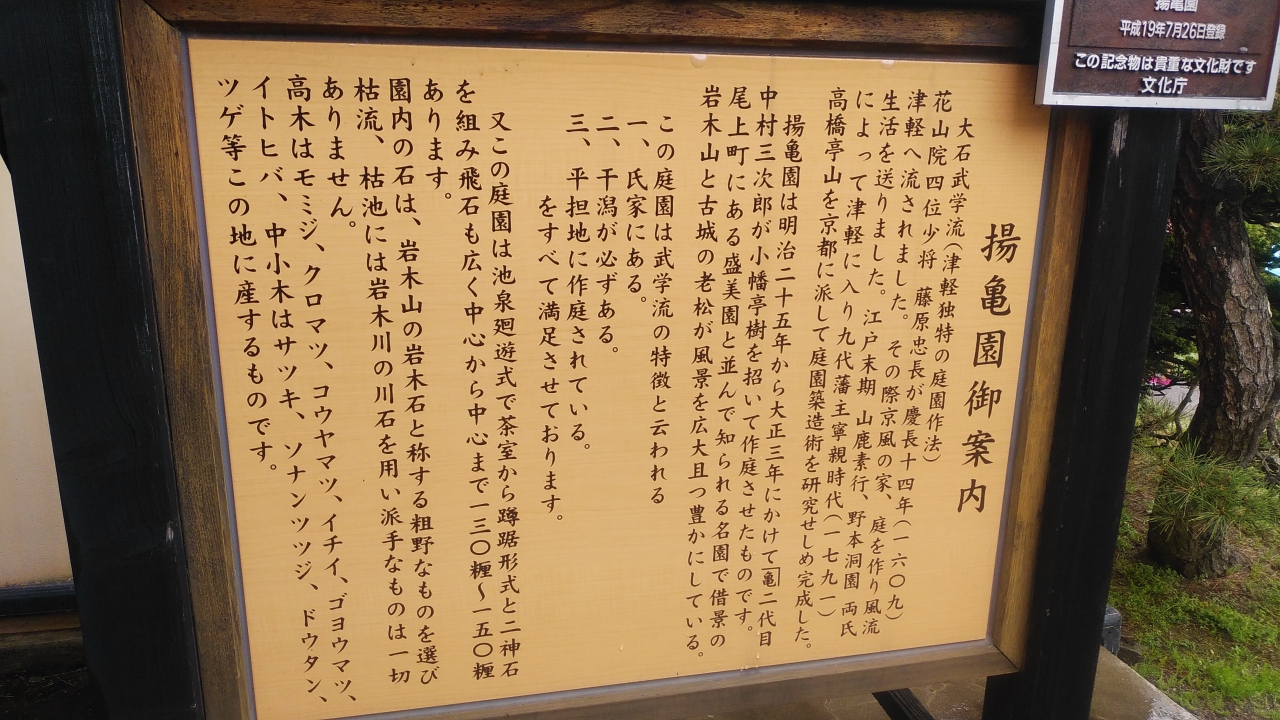 今日は朝から強い雨の中弘前城観光及び桜祭りを見て北門からねぶた村を観光しようとした道を歩いていると「揚亀園」という市の有形文化財に指定されている大きな大石武学流庭園があり、先ほどまで津軽三味線を聞いていたギャップに驚きましたが、岩木山の岩木石やクロマツ、コウヤマツ、イチイ、ゴヨウマツなど地のもので造られていて見事な庭園で得した気分でした。