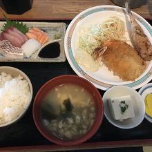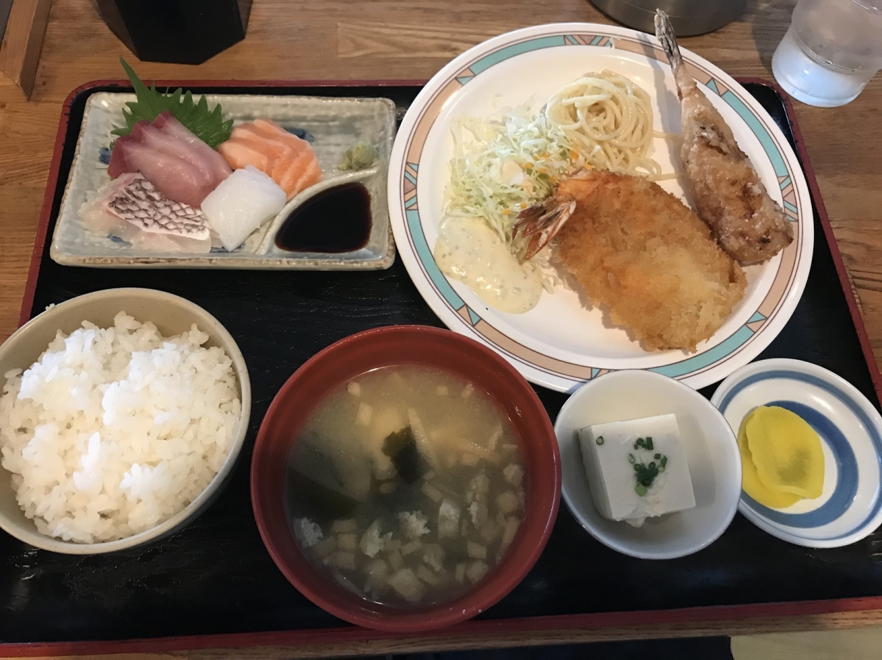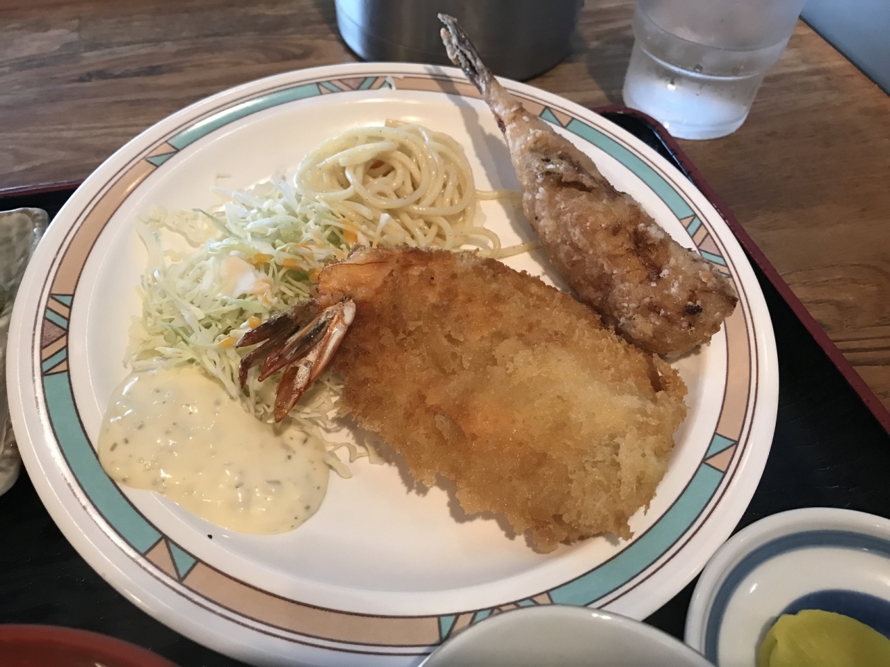 迷った結果、大エビフライ、ふぐ唐揚げ、刺身がセットになったよし定食を注文。ふぐ唐揚げは味が付いた衣のサクサク感が楽しめる。エビフライはたっぷりの自家製タルタルソースも美味しい。