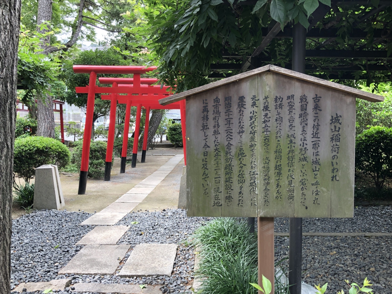 アイビースクエアの東側にひっそりとあります。こじんまりとした神社ですが、朱色の鳥居が連なっていて、きれいに整備されていたので気持ちよく散策できました。古びた説明板があり、移転を重ねて現在の場所に移ってきたことがわかりました。