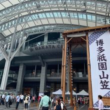 新幹線、在来線、地下鉄、超短距離バスのターミナルです。福岡空港からは地下鉄で二駅と至便です。在来線のホームには喫煙所があり、愛煙家には嬉しい限りです。ショッピングも充実しており、駅の1階、地下にはお土産物やが多数あり便利です。太宰府天満宮名物の梅ヶ枝餅も1階で買うことができます。私が行った際には駅前広場に山笠が展示されていました。