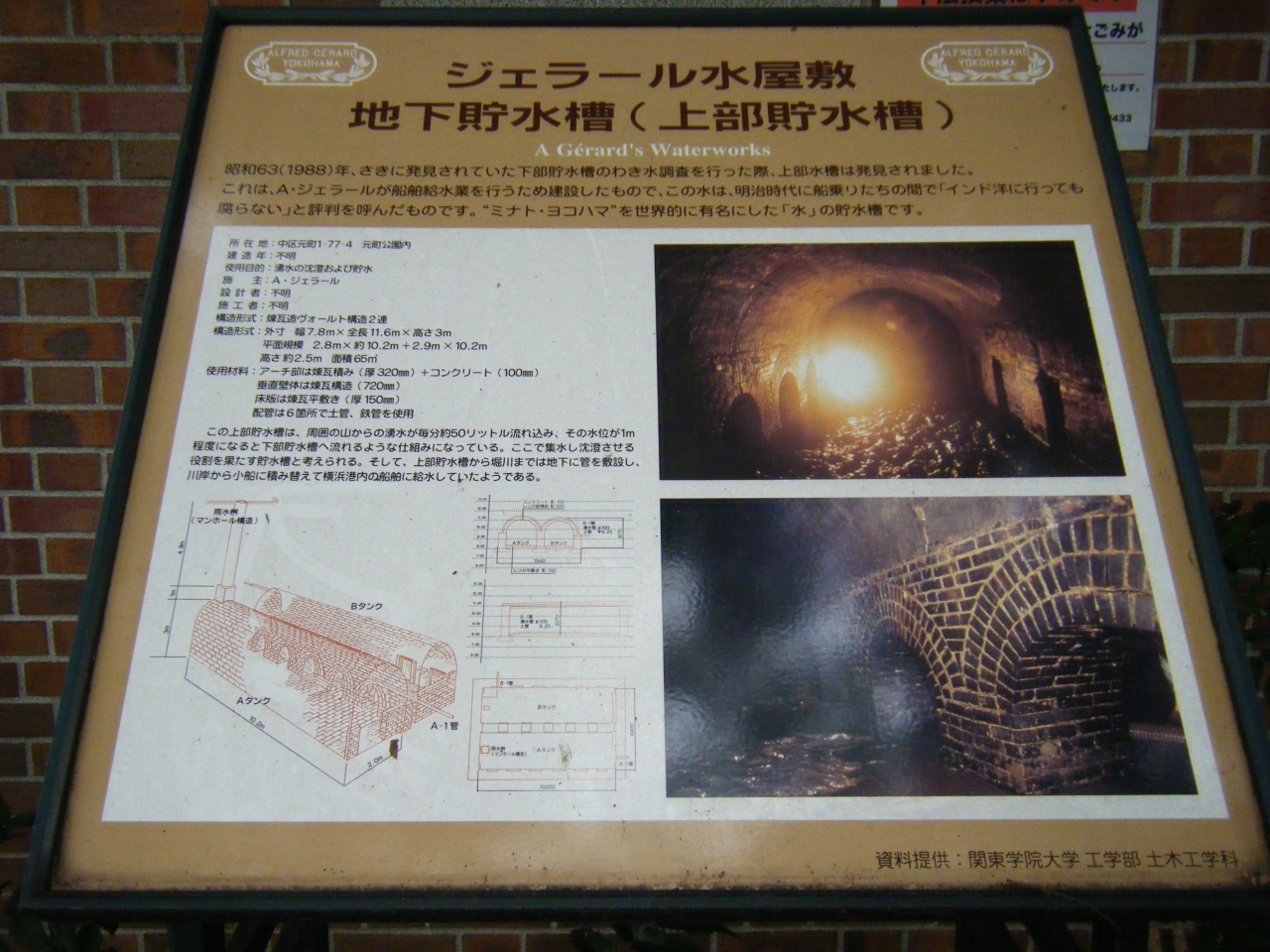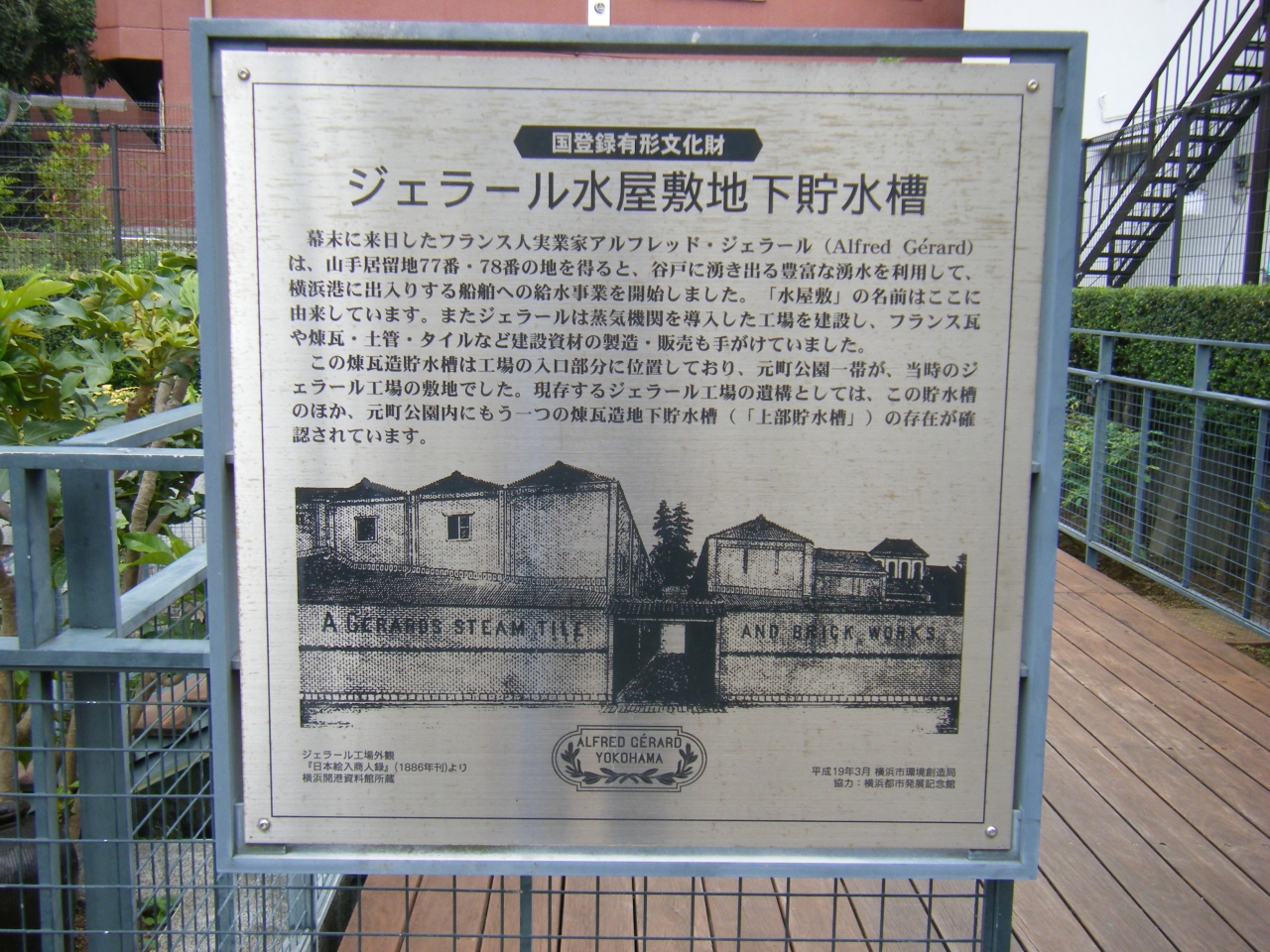 横浜の元町公園内にこちらの史跡はあります。開国後、横浜港は貿易港として開かれ、出入りする船舶用の水が必要となりました。そこに目を付けたのがフランス人実業家であるジェラールで、元町の谷戸の湧水を利用して商売を始め、この地に巨大な貯水槽を含む工場を建てたそうです。かなり大きな施設だったそうで、現在の元町公園一帯がそうであったようです。これだけ巨大な史跡が地下に残されているのかと思うとわくわくしますね。