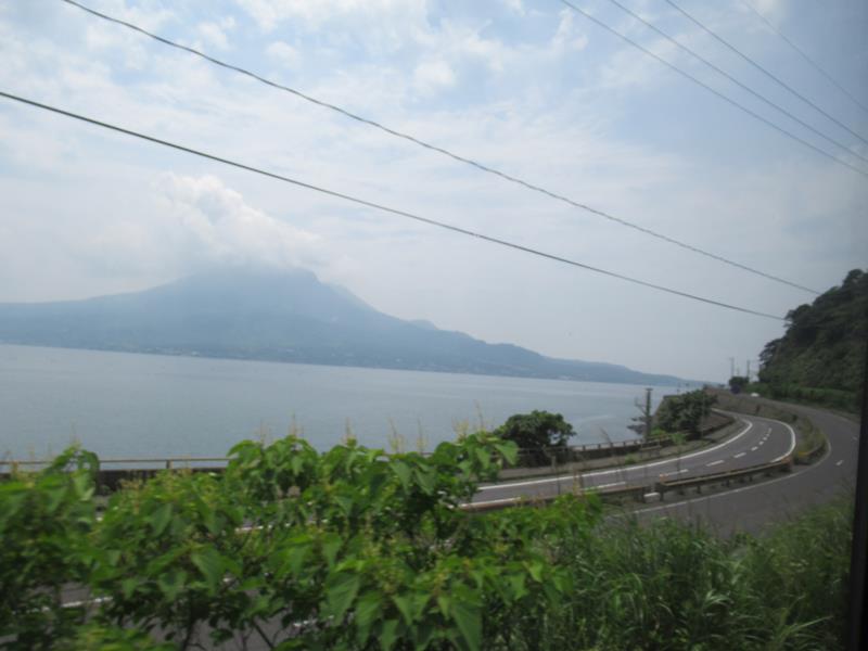鹿児島駅の手前から左側に錦江湾と桜島の美しい景色を眺めることができました。