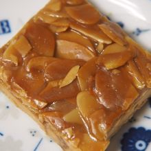 ポリポリのクッキーに、キャラメルで絡めたスライスアーモンドを重ねている。
