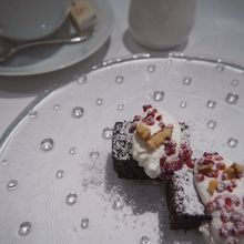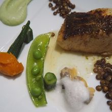 天然すずきのポワレ 香草ソースは、しっかりと火を通したすずきに、香草ソース、アサリのソテー、温野菜が添えられている。香草ソースは、スパイスをたっぷり使っていて、インド料理っぽい。フレンチでインド料理っぽい味付け、というのは奇妙だが、美味しくいただけた。ボリュームも、パッと見以上にある。