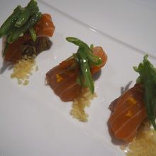 生サーモンのカルパッチョは、ナスのソテーに、生サーモンを被せたもの。クスクスが添えられている。柔らかくソテーされたナスと、プルプルのサーモンとの相性は良い。