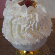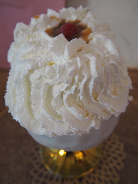 提供の段階では、絞り器によって絞られたと思われる生クリームが堆く盛られた容器となっていて、、上からキャラメルソースとキャラメルソースが覗いているだけ。容器も陶器製で透明ではない為、何が提供されたのかさっぱり分からない。