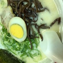 ラーメン500円で、替え玉一つ無料です。注文してからすぐ出てきます。具はチャーシュー、きくらげ、ネギ、卵半分と、500円とは思えないほど具沢山です。場所は新宿西口から少し離れていますので、注意が必要です。