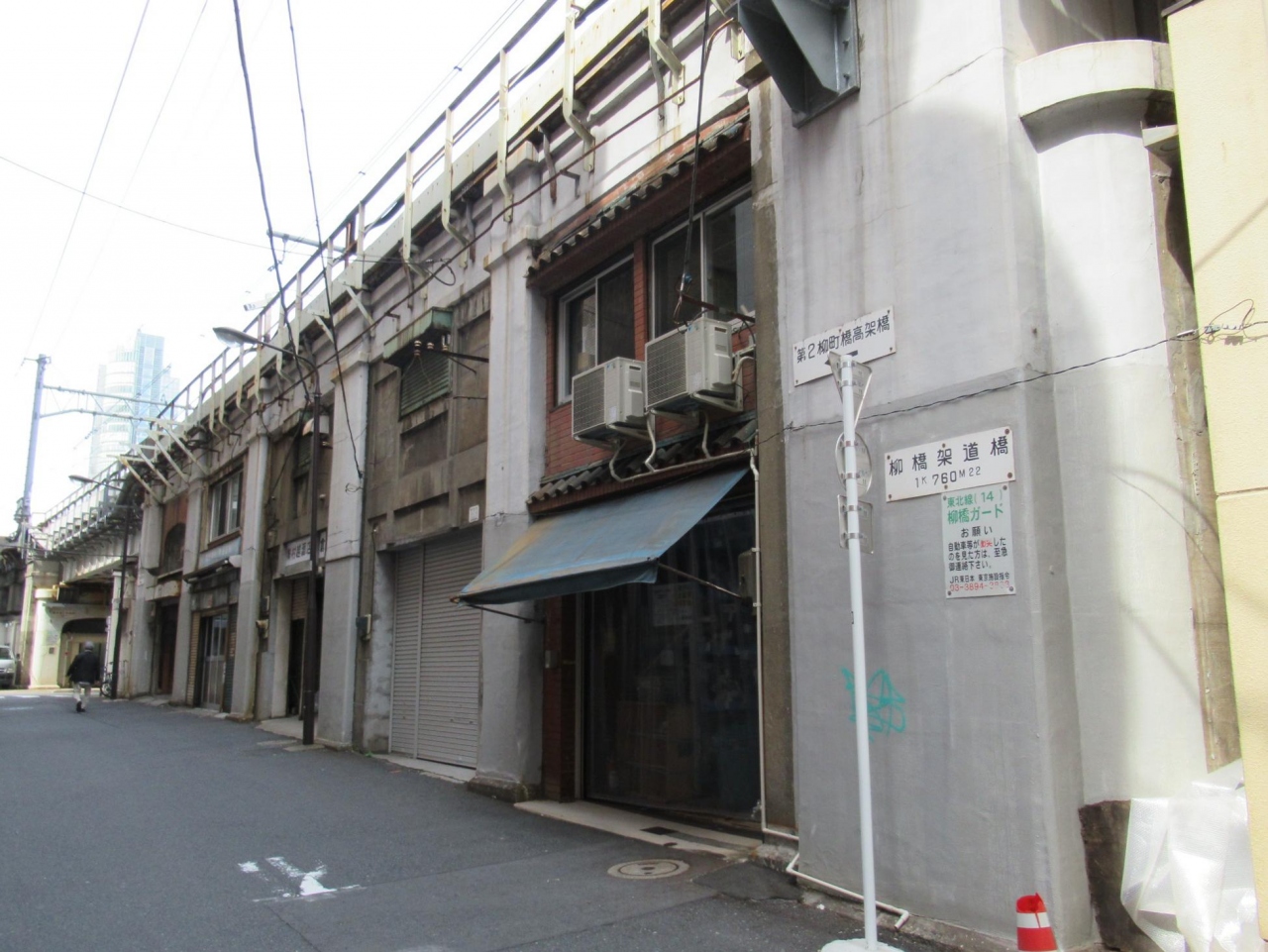JR秋葉原駅から神田駅 (南) 方向にも架道橋 (ガード) や高架橋があるので見歩くことにしその一つがここ 第2柳町橋高架橋 で、JR秋葉原駅の南側を流れる神田川に架かる神田ふれあい橋を渡り柳原通りに出て直ぐ右手 (西側) の柳原通り架道橋の向こう (南) 側が高架橋の北端です。