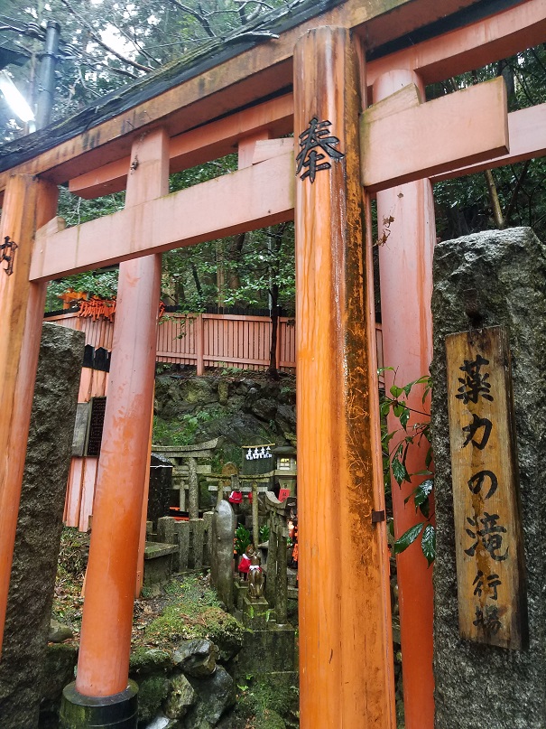 狭い階段を数段下りてみると奥まった狭い岩場に薬力の滝というのがあり小さな鳥居もたくさんあって独特な空間でした。