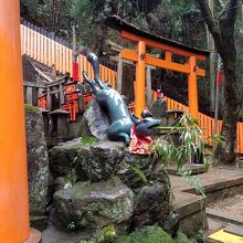 伏見稲荷の境内に入ってから、意外と狐様を見かける回数が少ないなと思ったいた矢先、ずいぶんとダイナミックなポーズをした狐様が現れました。良く見ると口にくわえた竹から水が流れていて一瞬ふざけてんのかとも思いましたが、ここが眼力社でした。