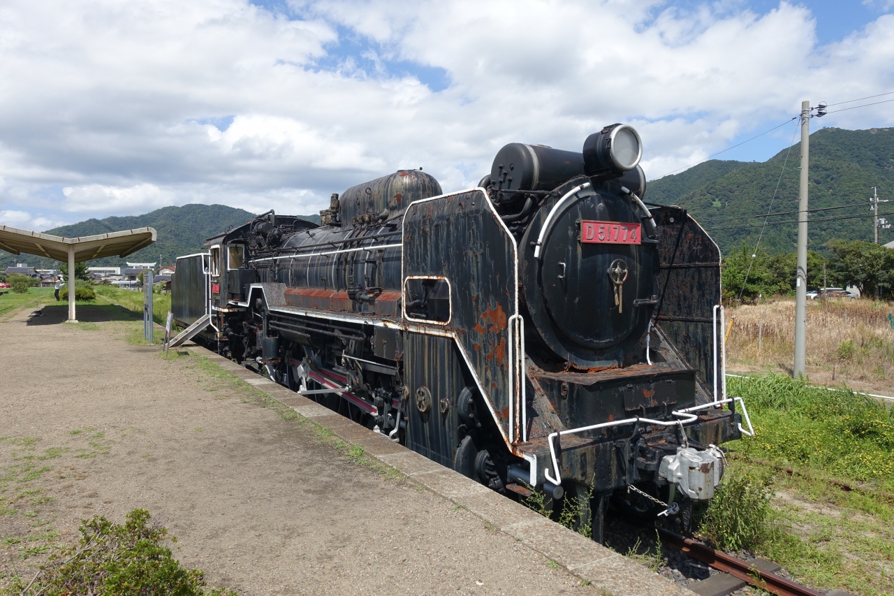 ここでの見所は、国の重要文化財に指定されている駅舎と保存されているD51形蒸気機関車(デゴイチ)です。外観も風格あるし、構内は格天井になっていて灯籠のような照明がレトロな雰囲気を出していました。窓口の中には人形が置かれて当時の様子を再現。時刻表も駅名標もレールもそのまま残っているので、今でも列車が来そうな感じ。