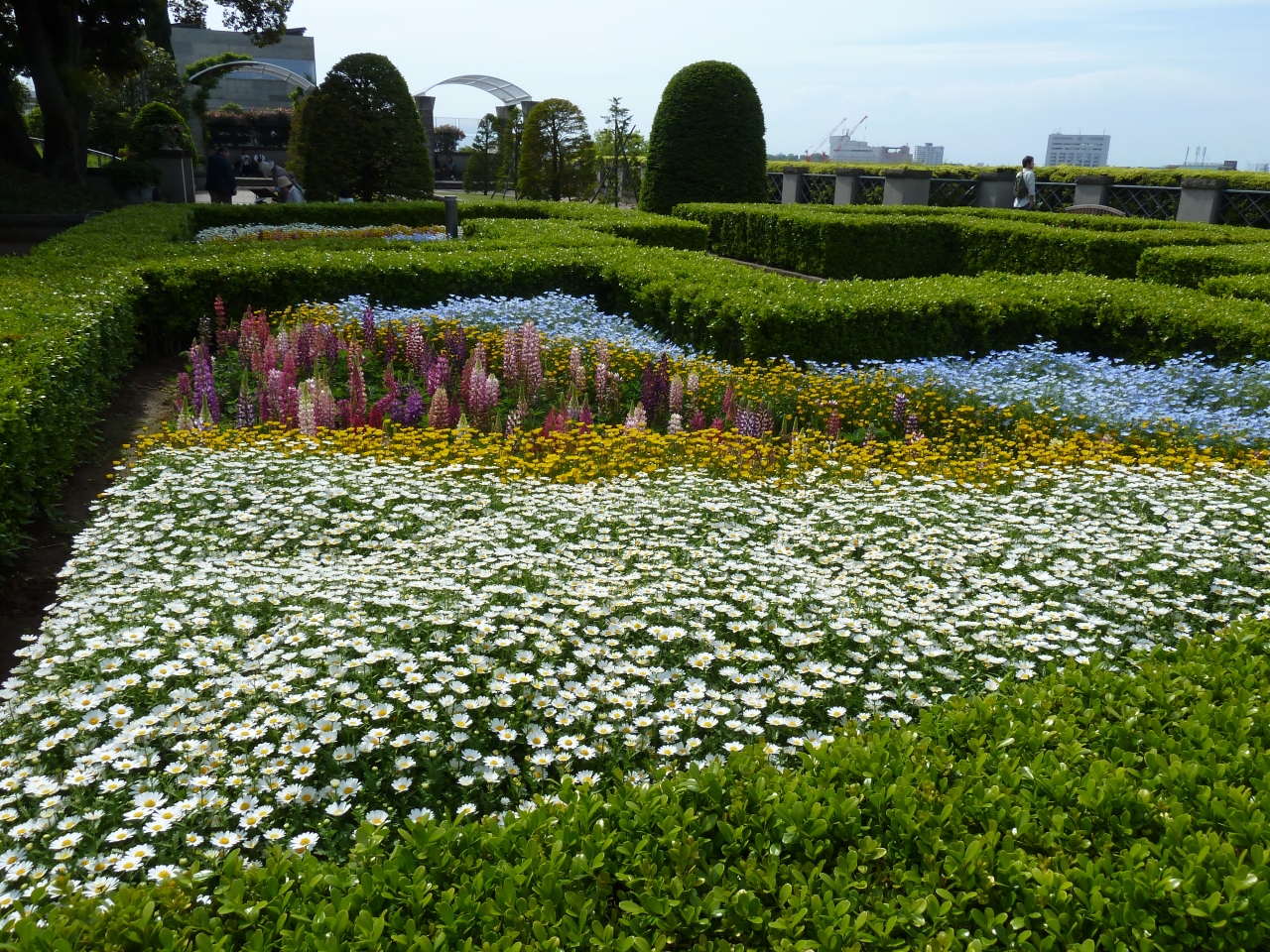 ブラフ18番館と外交官の家の間にある庭園で、幾何学模様の生垣がある。もともとイタリア領事館があったところだそうだ。花壇は、四季折々の花を植えているそうで、行った五月は、きれいに春の花が咲き乱れていた。