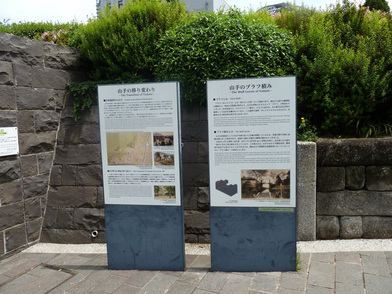 横浜外人墓地の前にある小さな一角。山手のブラフ積みなど解説板がある。その裏には、休憩施設と花壇がある。ブラフとは、断崖絶壁という意味らしいが、よく分からない。