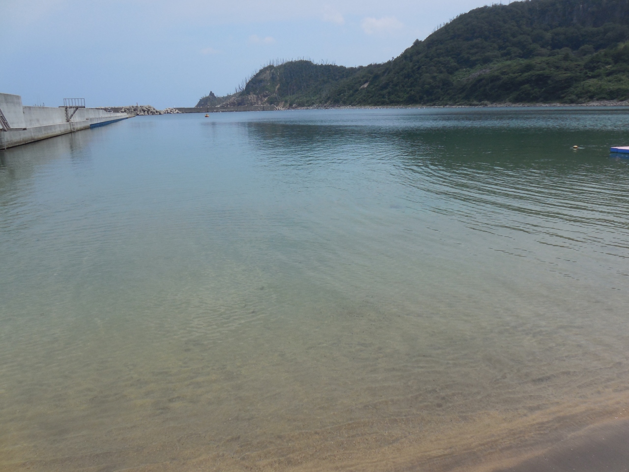 海水浴シーズンもピークを過ぎていたので、地元の小学生たちが数名で防波堤に設置された飛び込み台から海に飛び込んで遊んでいたり、小さな子供連れの家族が砂浜で遊んでいる程度でひっそりとしていましたが、波が穏やで透明度の高い澄み切った海と白砂がとてもきれいな『中村海水浴場』は、防砂林の松林の木陰で休憩しながら小さい子供でも安心して海遊びが楽しめる家族連れにお勧めできる海水浴場です。