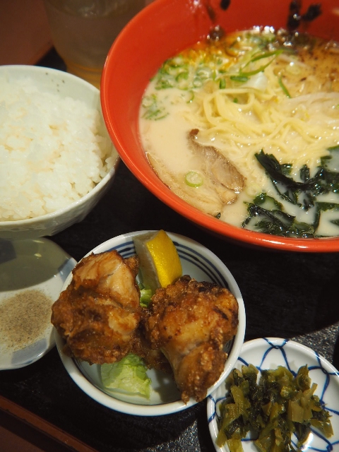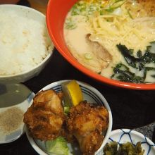 牛じゃんラーメン、から揚げ、そしてライスから成る。
