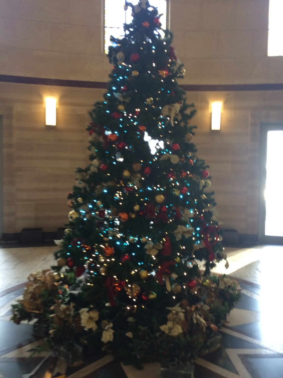 京阪北浜駅直結の大阪証券取引所。株価ボードと椅子があるあたりの広場で、季節ごとの装飾イベントがあります。クリスマスツリーや七夕など。少し目線を上に見上げると窓のステンドグラス?がキラキラ綺麗です。見てみてください