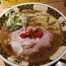 麺は平打ちやや縮れで、わざと幅広くした麺も混在しているのも特徴。