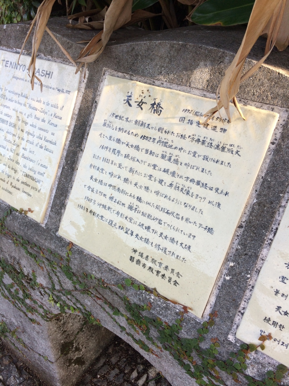 石造りのきれいな橋です。当初は観蓮橋と呼ばれていたそうです。橋の近くに「国指定建造物」と書かれた表記に書いてありました。沖縄の他の建物同様、沖縄戦で破壊されてしまいましたが、復元された貴重な橋です。欄干に苔が生えて風情がありました。