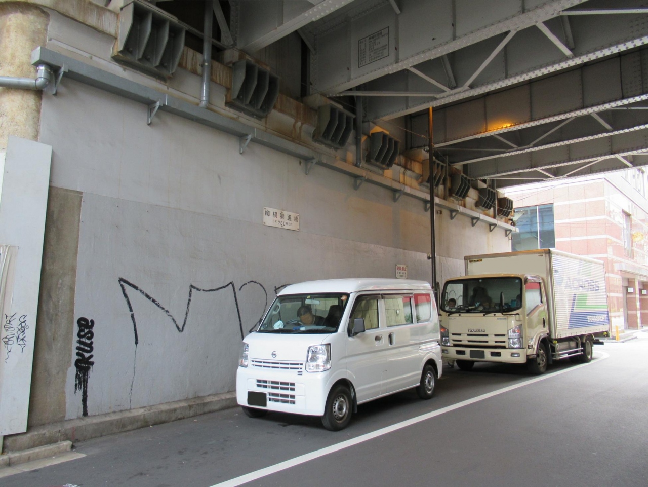 この架道橋は、柳原通りと南側を走る幹線道路の靖国通りの中間辺りにある程々の広さの通りにあり、人も走っている車も見掛けず、山手線と京浜東北線を支える西側が広くなっているので車が2台停まり休憩している位で寂しく感じたところです。
