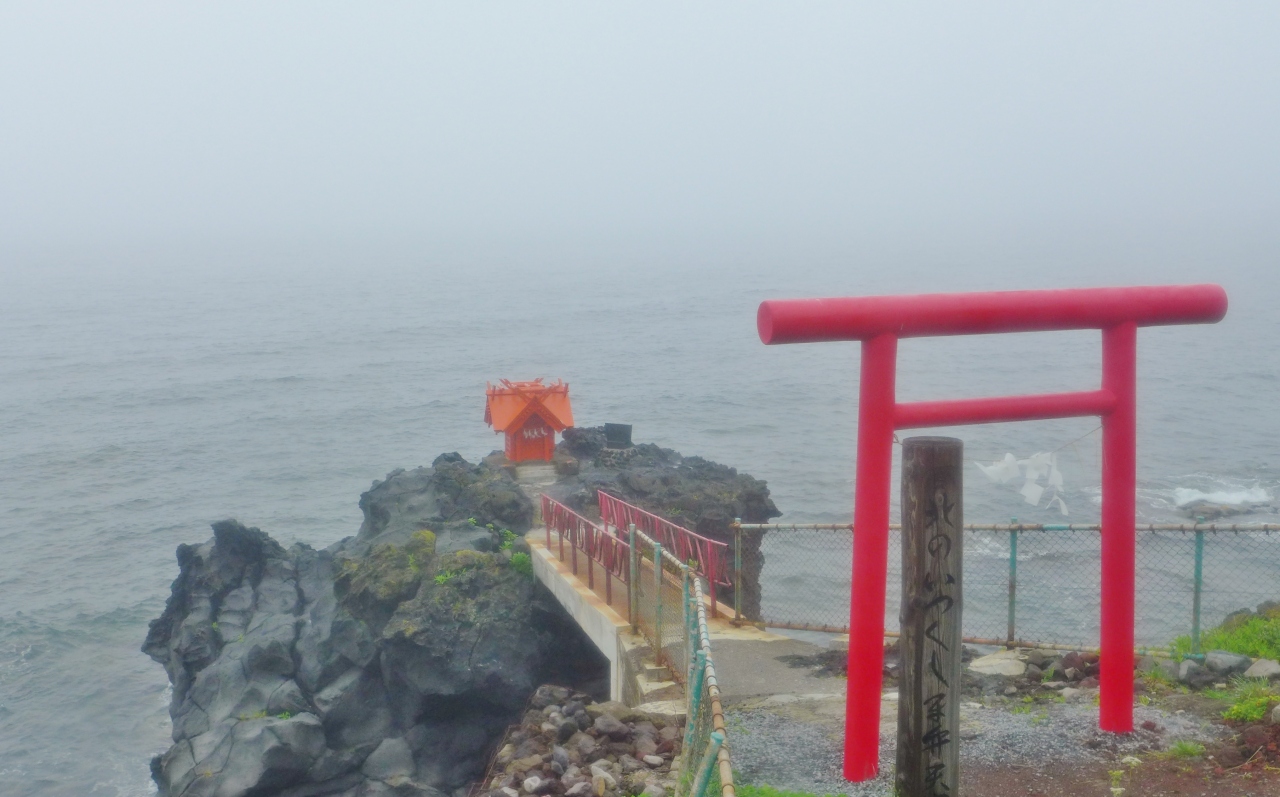 利尻島の西海岸、寝熊の岩や人面岩の近くにある弁天様です。