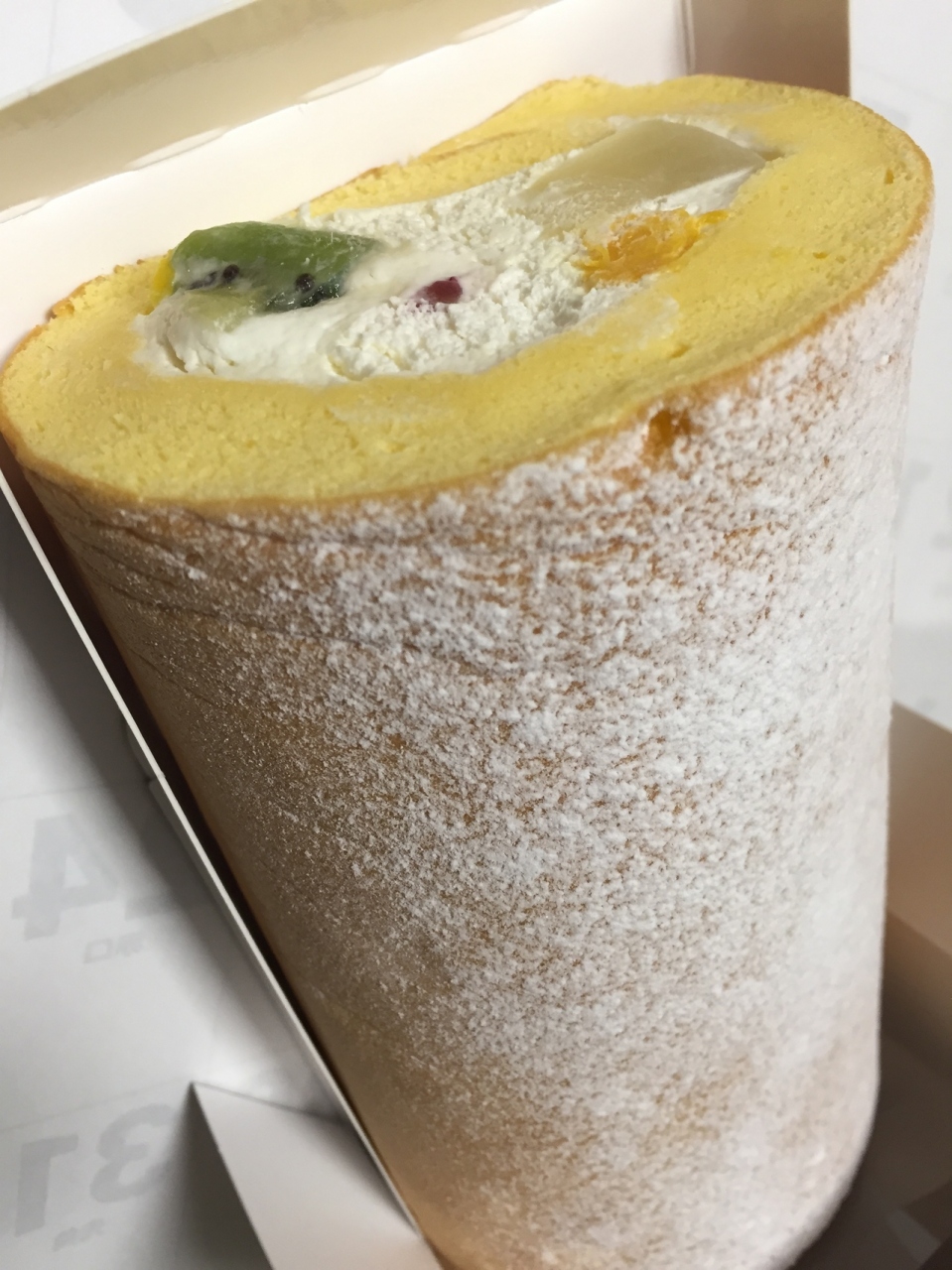 ロールケーキが猛烈に食べたくなり、色々お店を見回り、モンシェールさんのロールケーキを購入しました。見た目から見て分かるように生地が黄色くて卵がたくさん使用されてるのかなぁという印象です。入っているフルーツはバナナ、柑橘系、キウイ、バナナ等で美味しかったです。