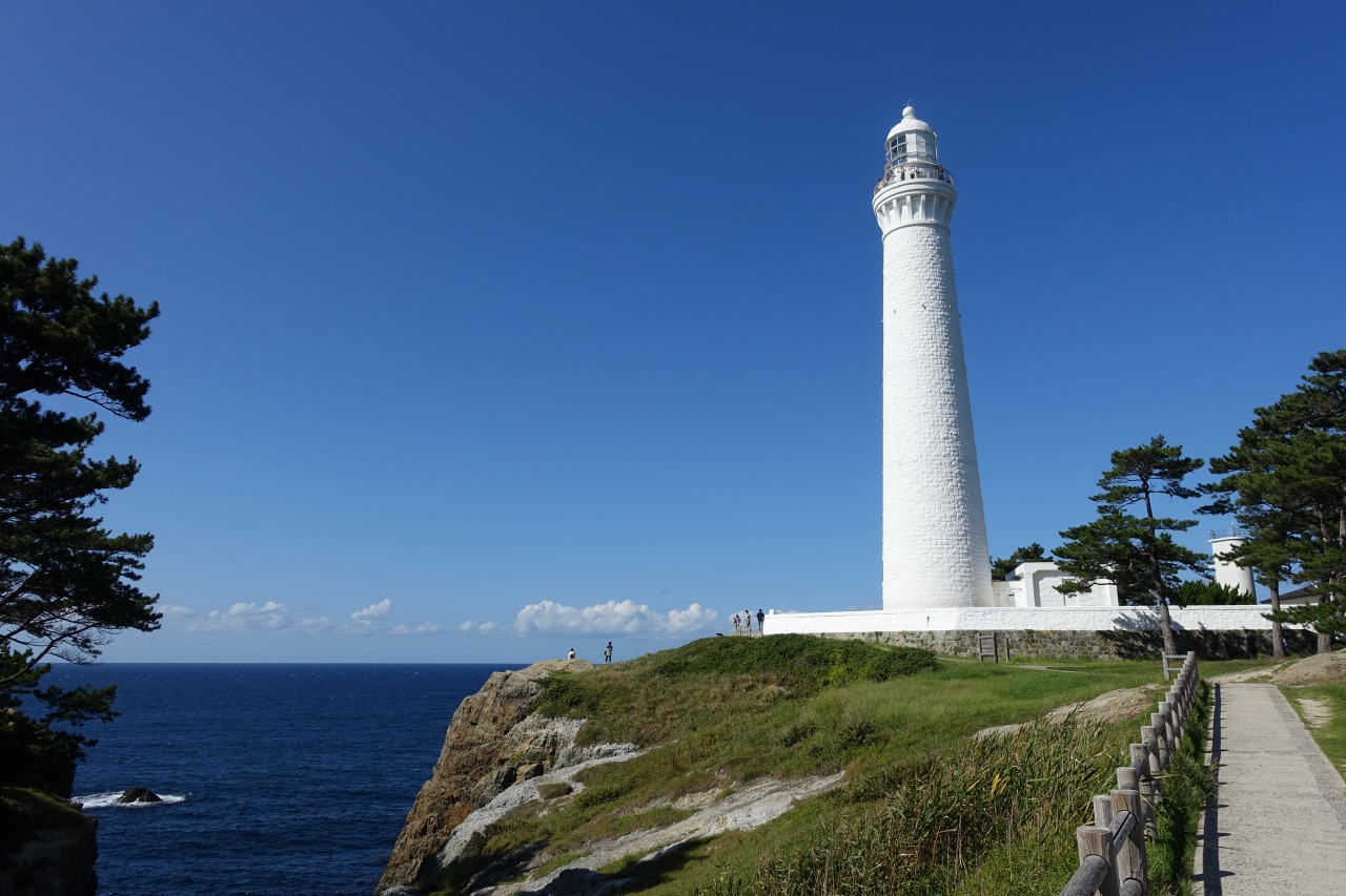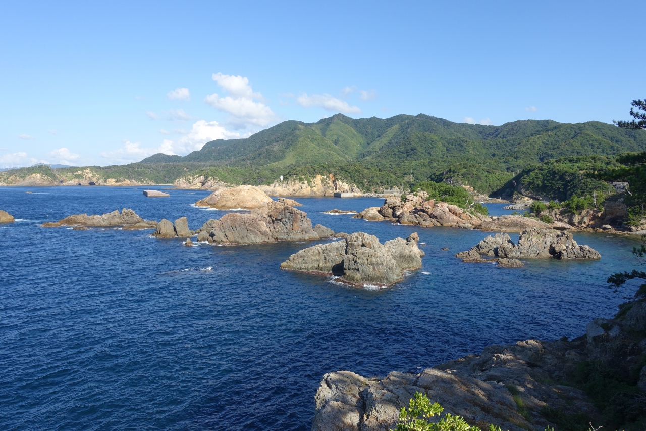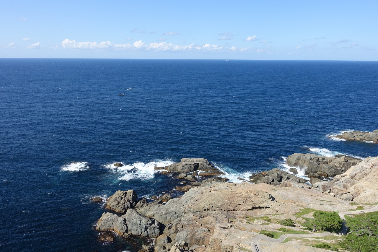 岩場の海岸です。海岸の風景は、近くで見るなら遊歩道を歩く、高所から眺めるなら灯台に登る と2通り楽しめます。経島や出雲松島を見るには遊歩道を先のほうまで歩く必要がありますが、とんでもなく遠いわけでもないので比較的行きやすかったです。海の青色が日に照らされてキラキラ輝く光景に癒されました。