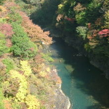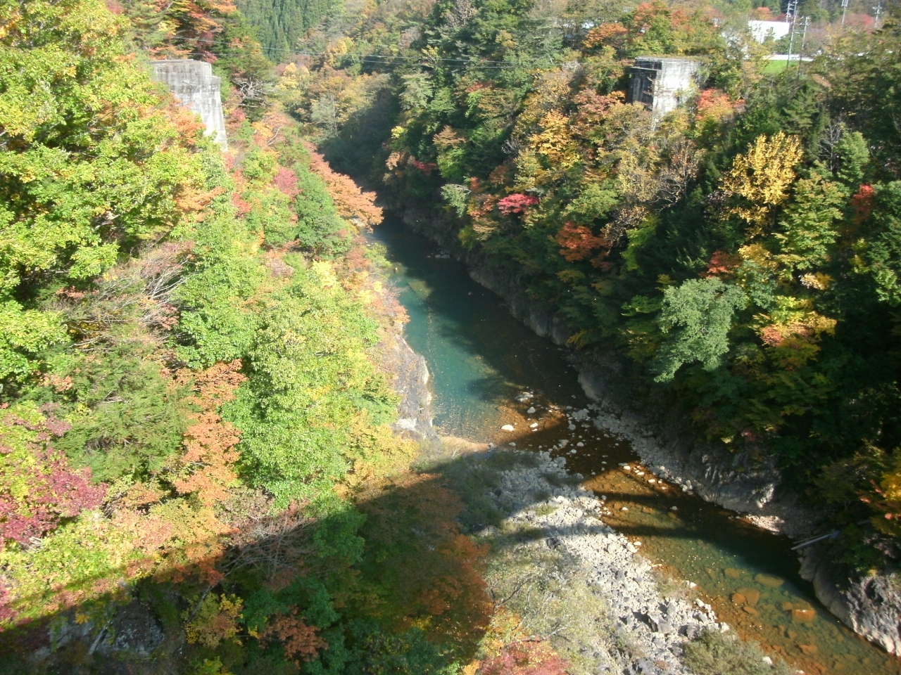 ロックフィルダムなので堤を歩いて下流側を覗いてもそれほど迫力はありませんが、訪れたのが10月中旬ということもあって堤頂から見る大滝川や周辺の山々の紅葉風景は大変良かった。