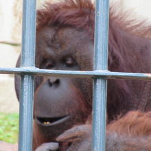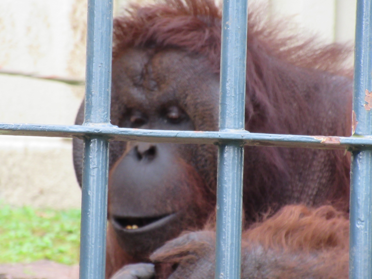 ちょうど、もぐもぐタイム時に遭遇しました。オランウータンの生態等を聞きながら、えさを探して食べるオランウータンのジャックの動きはかわいく思いました。ただ与えるだけでなく「探させる」という行為は少しでも自然界にいる状態に近づけるための工夫のひとつだそうです。
