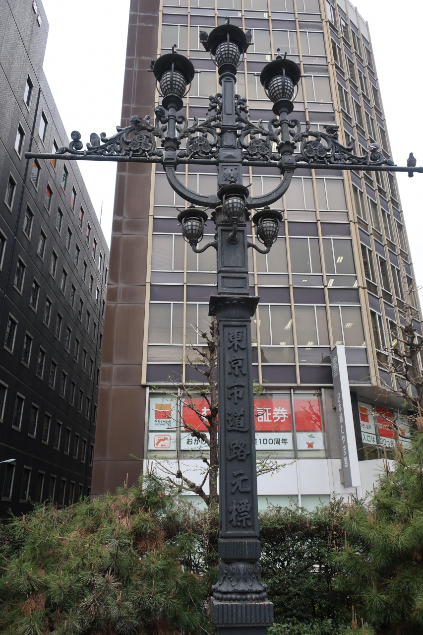 日本橋の北詰め元標の広場に電燈の様な形をしたものがあります。これが旧東京市道路元標です。元々は現在の日本国道路元標のある日本橋の中央に設置されていたものが移設され現在の場所にあります。殆どの道路元標が石造りなのに対し、首都東京だけあって電燈のついた洒落た造りなのは驚かされます。