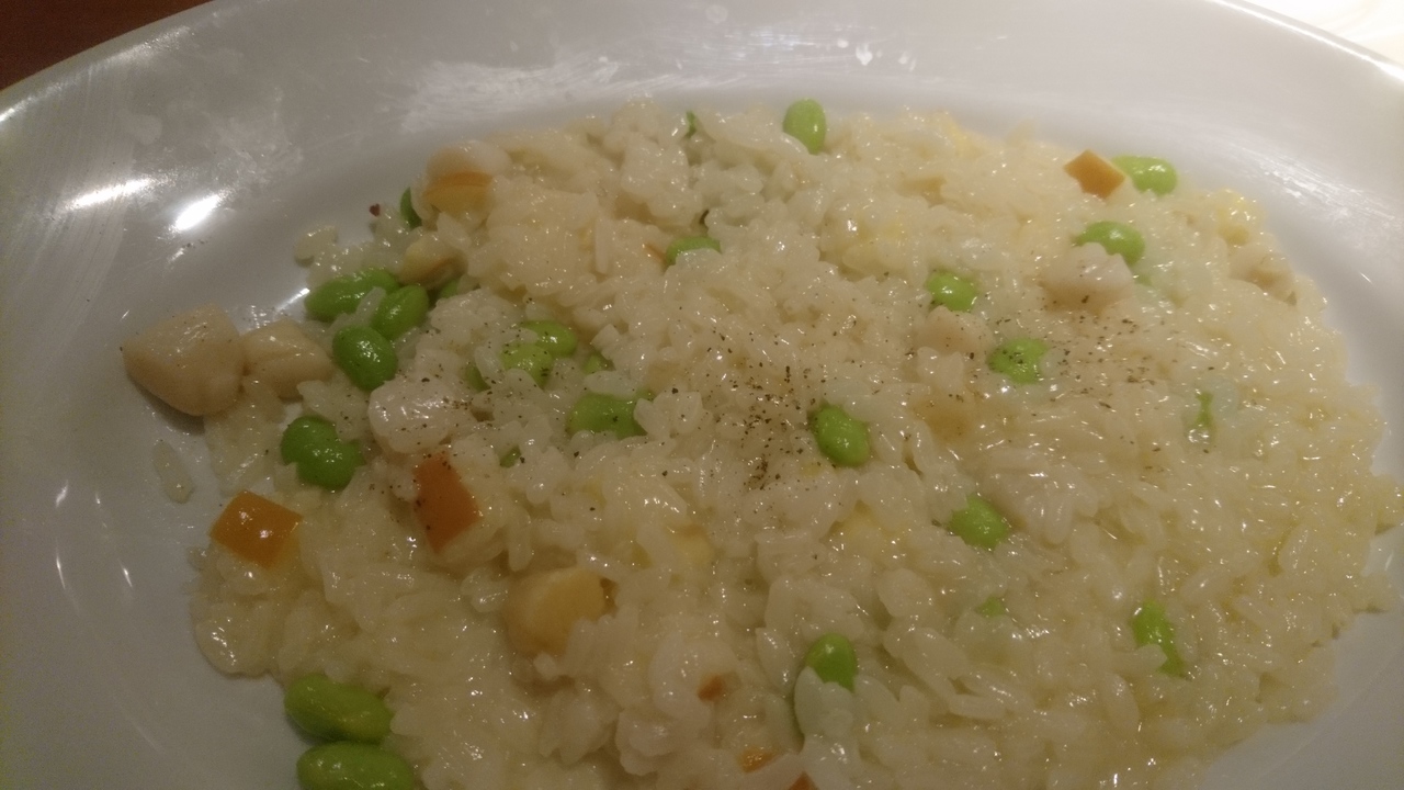 JR・東武柏駅直結の柏ステーションモールS館7階、レストランフロアーにある洋お店です。パスタ、ピザ、ステーキ等の肉料等々、洋食全般を食べることが出来ます。ピザとパスタは何度か食べたことがあるので、今回はリゾットランチ(¥1,580 サラダ・ドリンク付)を注文。小柱と枝豆、スモークチーズのリゾットは、彩りは綺麗ですが、小柱はかなり少なめ、スモークチーズも安いおつまみにあるような、あまり香りを感じないチーズでした。周りのお客さんもピザを食べている人が多かったので、素直にピザを頼むべきでした。味は三笠会館系列のお店だけあって、まあまあです。