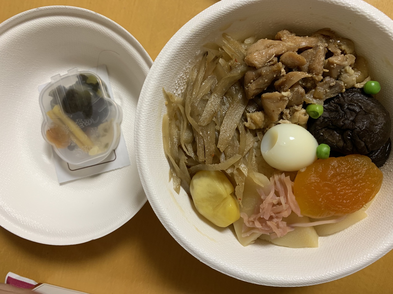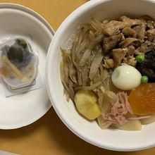 夜ご飯用にこちらで駅弁を購入しました。たくさんあるお弁当を目の前にどれにしようとかなり迷いましたが、最近食べていなかった釜飯にしました。陶器の容器ではなく、紙の容器でした。陶器の容器は味があり良いですが、結局処分にも困るのでエコでいいなと思いました。
