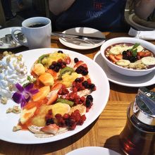 日曜日のお昼ごろだったので、1時間ほど待ちました。駐車場も満車でした。夫婦二人で、パンケーキとアサイーボウルを注文。まわりのお客さんはファミリーが多く、お肉料理などのしっかりしたお食事を楽しまれているようでした。