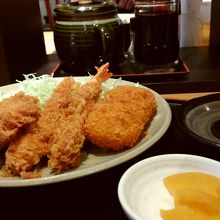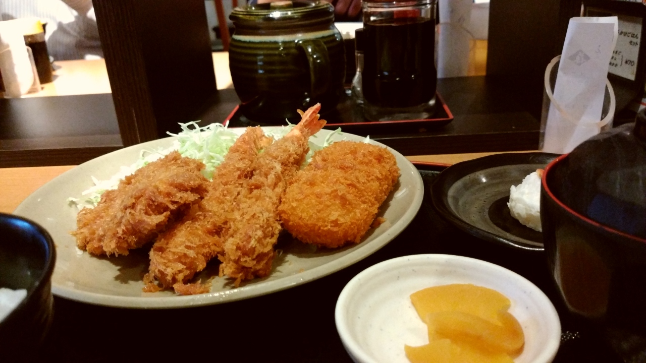 ランチメニューの「ミックスフライ」を注文。 昼食のサラリーマンがどんどん入ってきますが、効率よく注文、配膳と進めています。 テーブルには「味噌だれ」の壷があり、フライにこれをかけて食べると、とても美味しいです。 リーズナブルなのに、キャベツのおかわりも無料でできて、とても良かったです。