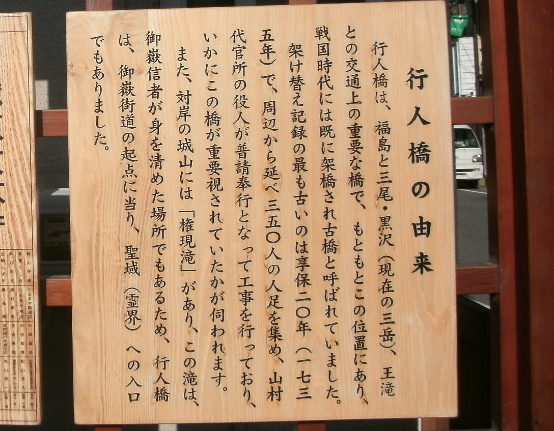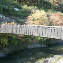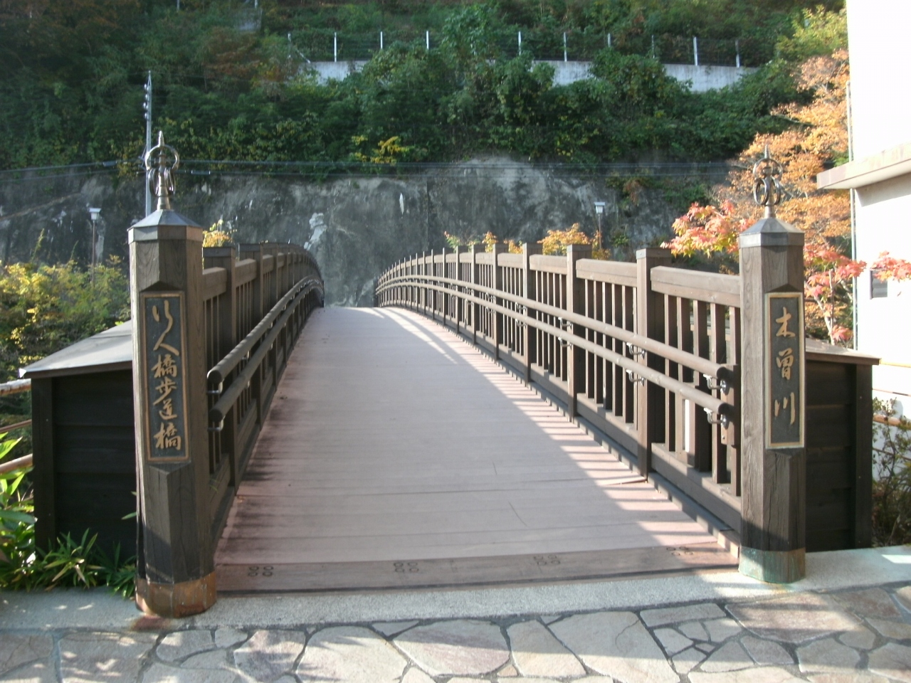 木曽川に架かる歩道橋です。近くにある説明板によると、三岳(福島、三尾、黒沢)と大滝との交通上重要な橋で、戦国時代から架けられていて、最も古い架け替え記録によると1735年に山村代官所の役人が普請奉行になり工事を行ったとか。現在の橋は平成17年に竣工した新しいもので、歩行者専用の緩やかなカーブを描く木製の橋はなんともいえない風情をかもしだしています。すぐそばには足湯もあるのでゆっくり散策するのに良いところだと思います。