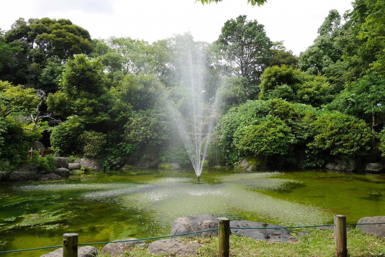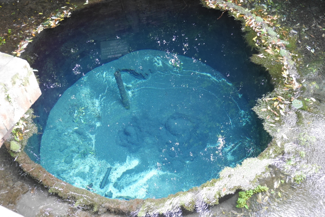 6がつ下旬に訪れました。国道ぞいの広い公園です。公園に入ると噴水があり、右手に進んでいくと第一展望台があります。展望台とはいえ、上に登るのではなく、下に下っていきます。そこでは、水が澄んでとてもきれいなので、地面から湧水しているところがよく見えます。そこから5分くらい歩いて第二展望台に行くと、昔の紡績工場の跡地で、大きな井戸から水が沸き上がっているのがよくわかります。