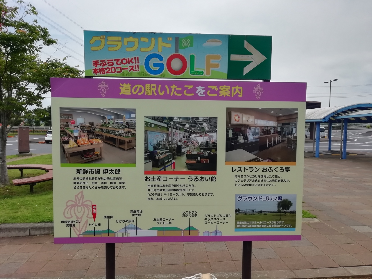 潮来ICを下りて県道101号線を走ること1分、道の駅いたこの看板が見えてきます。駐車場も広く利用しやすい道の駅です。売店も土産物や地元の、特産品や野菜なども売られていますが、ビックリしたのは敷地の広さ。太陽光のメガソーラーやゴルフコースなどもあります。車の無い方でも無料送迎バスがあったので利用可能かと思います。興味のある方は是非。