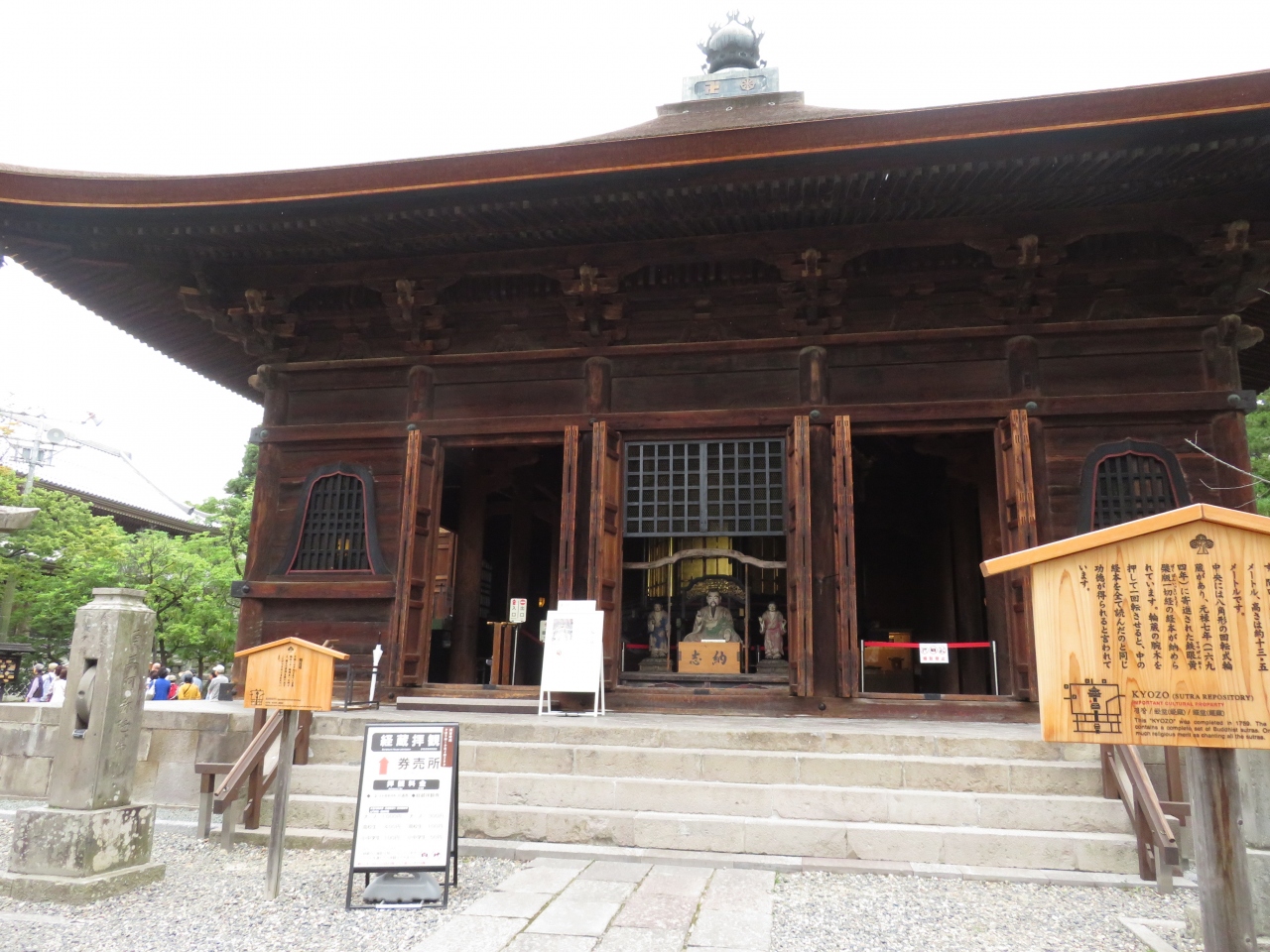 お経を読むことができない人の為に、一度回せばすべてのお経を読んだことになるという経堂、ちょうど女性が入ってきたので二人で回しました。かなり大きいので、かなり重いです、一人では回せないので数人で回してみてください。