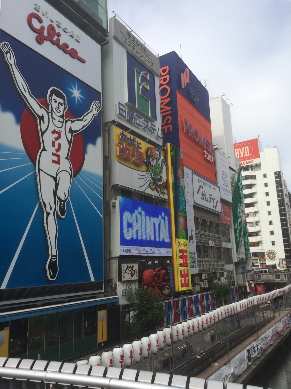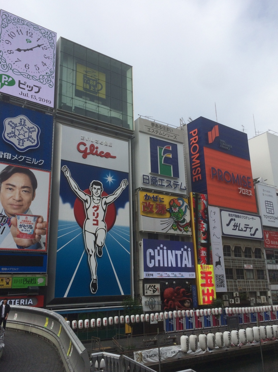 以前夜訪問した時はネオンがたくさん灯っている中でもかなり目立ちましたが、日中に行っても迫力がありました。縦長の看板で白と青基調の色合いで道頓堀川沿いにあり、目の前の橋からはたくさんの観光客が写真を撮っていました。