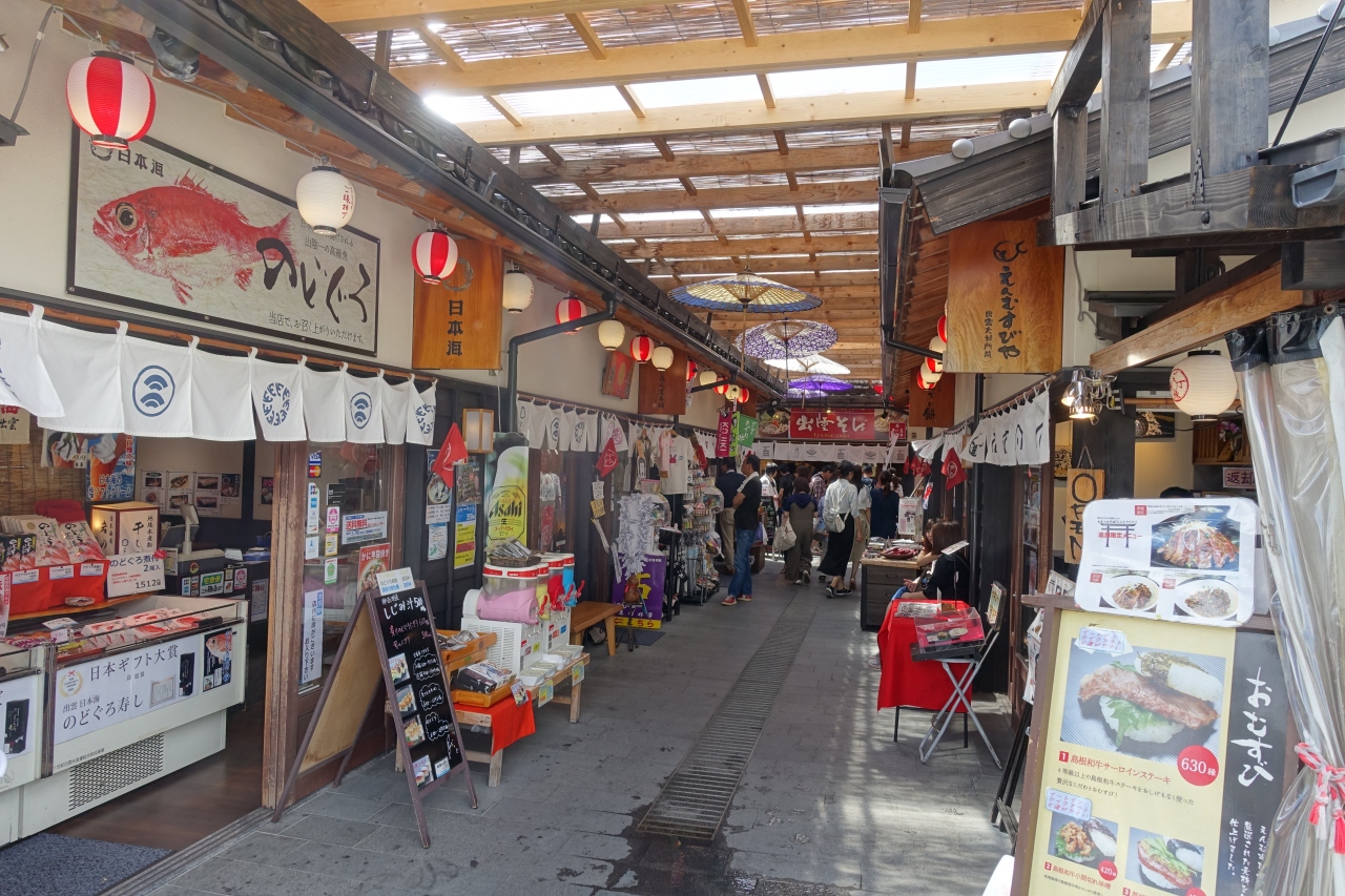 場所は勢溜の鳥居のすぐ目の前。飲食店や土産物店が数店舗軒を連ねる観光客向けの商業施設です。屋根が付いているため雨でも安心かと。雰囲気は悪くはないので気楽にぷらっと寄ってみるにはいいと思いますが、規模が小さく道も狭く、いまひとつ物足りない印象でした。伊勢神宮のおかげ横丁の超小型バージョンといった感じ。