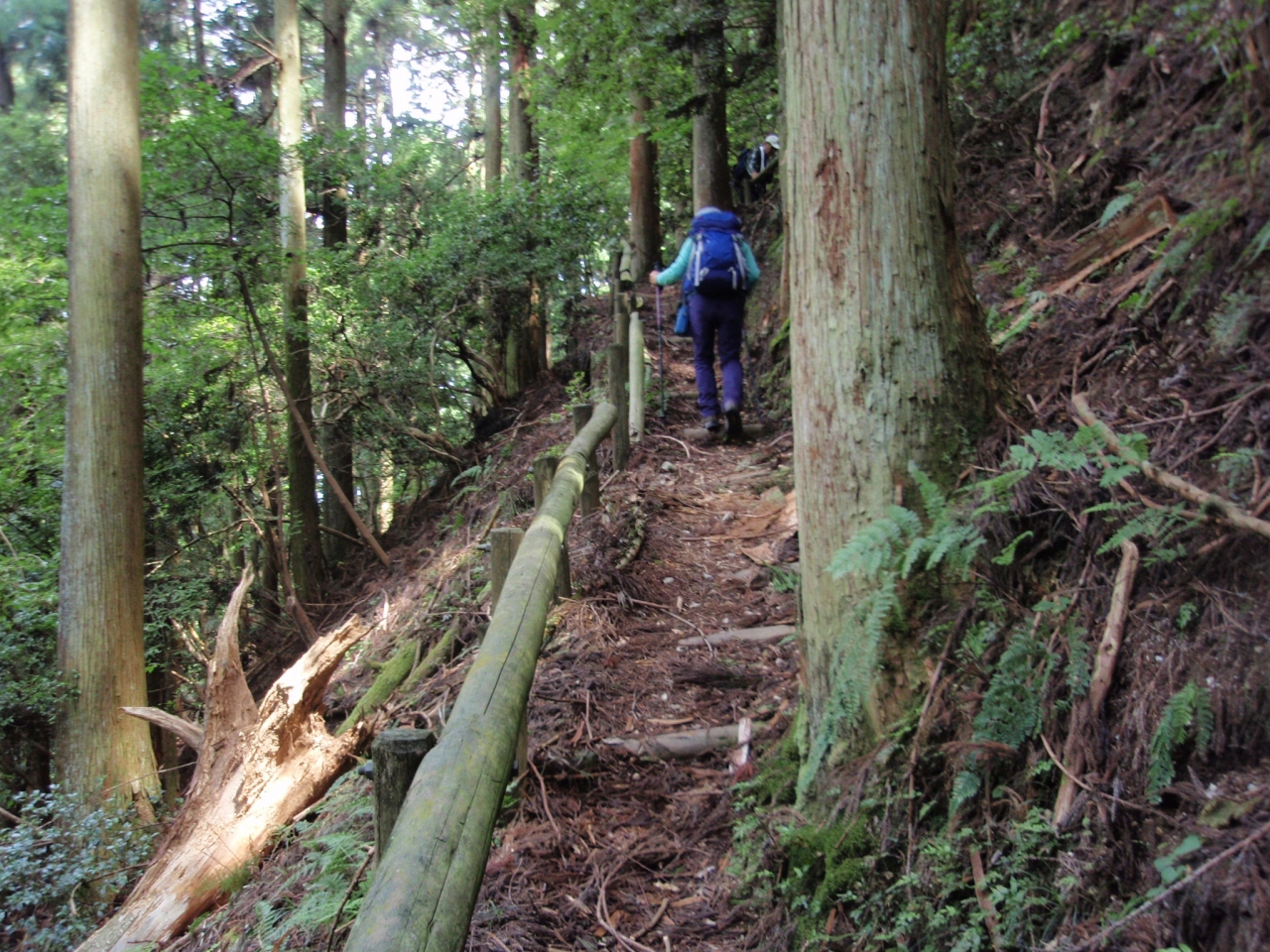 出町柳駅を出発し、茶山山頂(180M)で京都一周トレイル東山コース(以下京都トレイル)に合流し、石鳥居で京都トレイルと別れ、歩き始めて3時間一本杉に到着(標高600M)。展望が開け琵琶湖も見えます。下山は崇福寺跡、百穴古墳群を経由してJR大津京に下りました。百穴古墳群は石室の入口が穴のように多く見えるところから名付けられました。本日のコースは標高差520M,歩行距離16Kmと長いですが、一部の木段急登りが、急下りを除いて歩き易い登山道でした。ただし、下山した後、最寄り駅までの舗装道歩き45分は、気温34度と暑くバテました