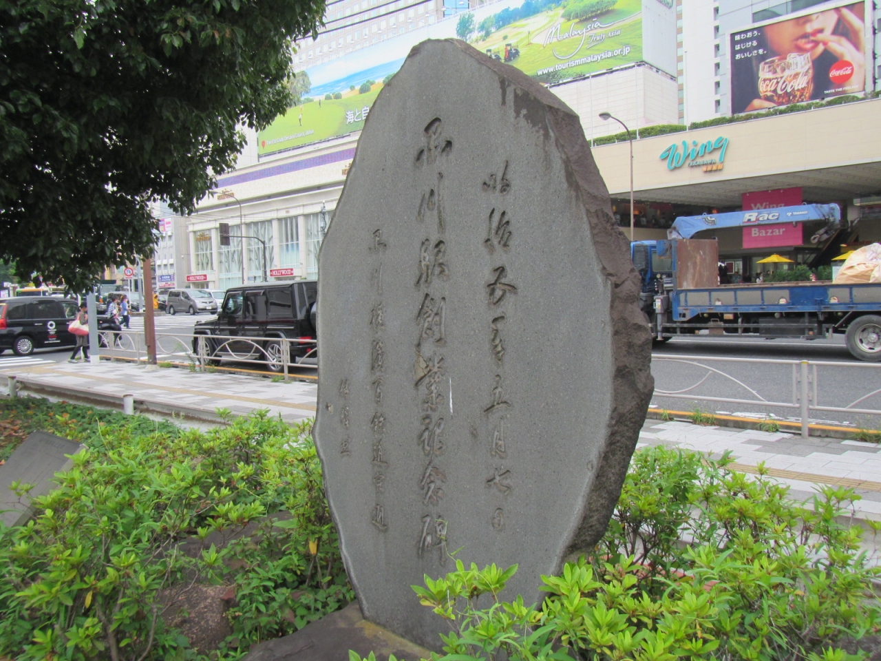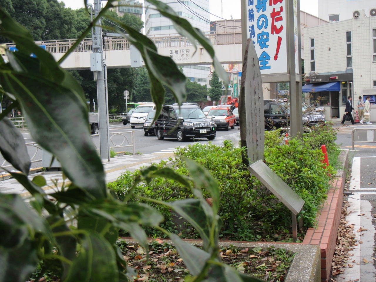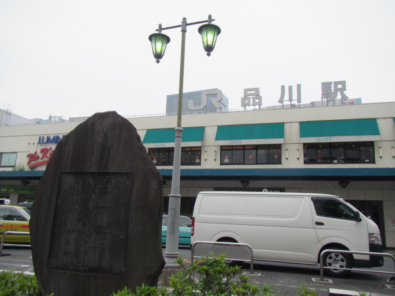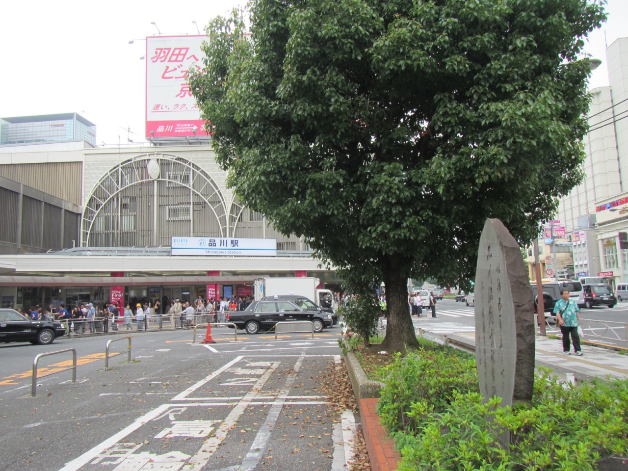 品川駅の高輪口(西口)を出て駅前ロータリー上にある石碑です。