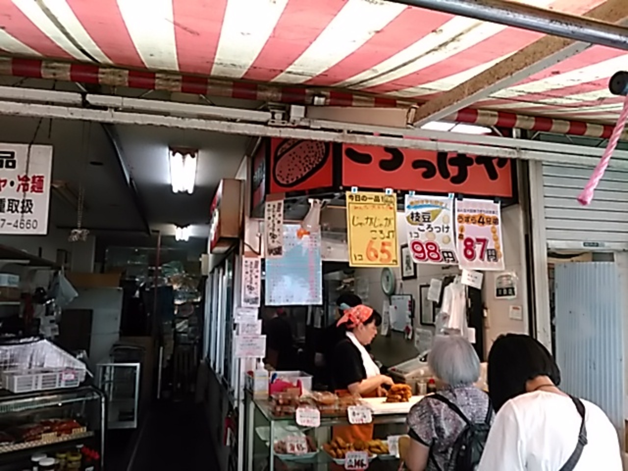 南町通りの南側にある仙台朝市の真ん中位にあります。朝市をぐるっと見ましたが、惣菜店はここだけのようです。メニューには、じゃがじゃがコロッケ65円からロースカツ227円迄20種類位あります。今回は、ウズラ卵の串とじゃがじゃがコロッケを買いました。じゃがじゃがコロッケは、ソースがないのが寂しかったです。
