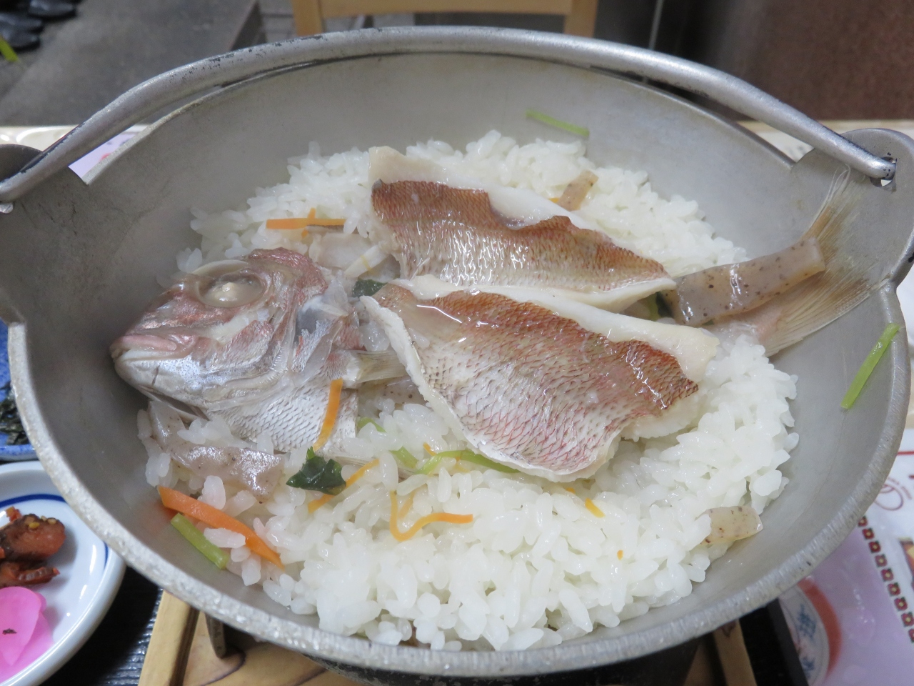 中予風すなわち鯛を焚き上げる鯛めしを注文。20分かかります。それは仕方ないのですが、それまで何も出てきません。炊きあがった鯛めしにご対面するまでにお銚子2本クラクラになりました。残念だな。