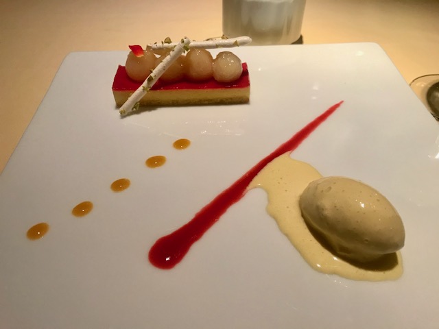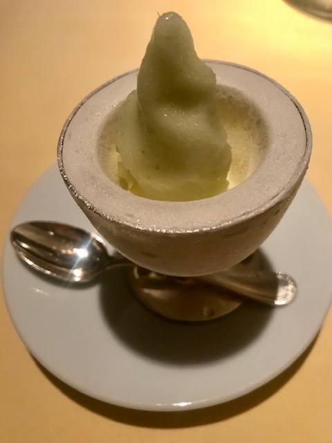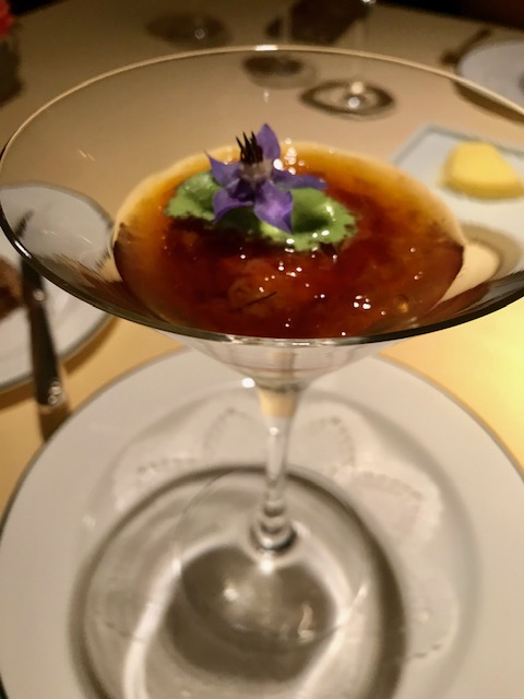 コンソメジュレと香草のソルベが夏らしい一品。文句なく美味しかった。